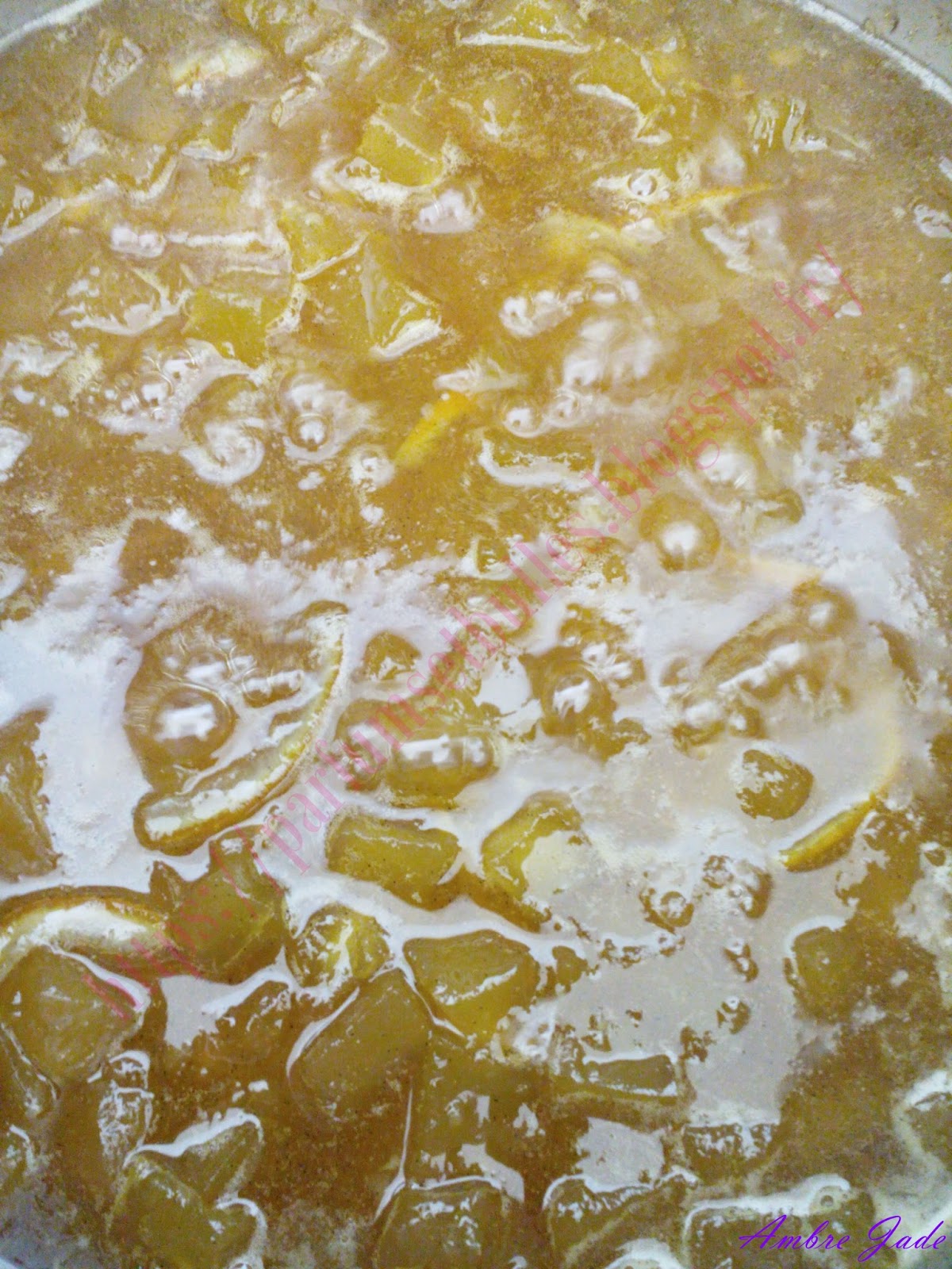 - 4 ième jour une heure trente toujours sans couvercle en remuant de temps en temps et le soir Jusqu'à cuisson complète , vos cubes seront de transparence vêtus, comme confits et aériens , à Surveiller c'est comme le faisait ma grand -mère pour parfaite jusqu'à son dernier souffle la Barbarine, cette ultime cuisson sera définitive et hop en bocaux stérilisés et à tête en bas !